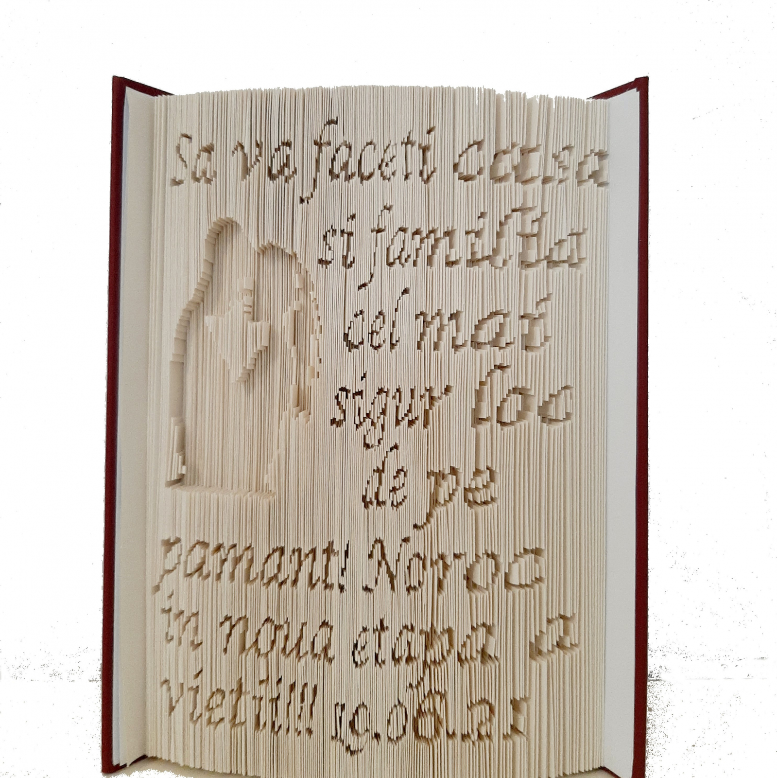 Fiecare fila a cartii este sculptata cu multa dragoste si grija, pentru a rezulta mesajul sau imaginea dorita de tine.